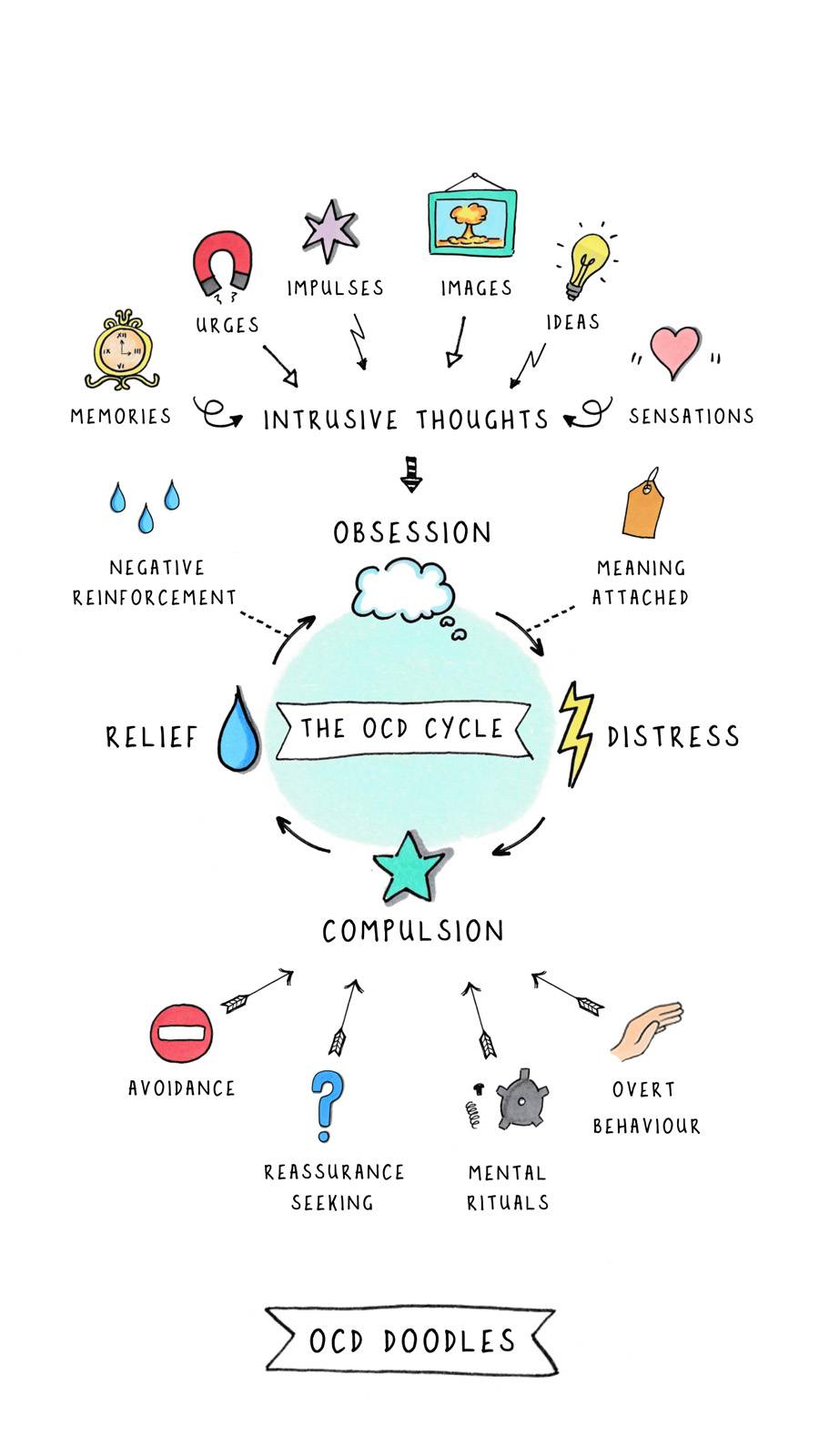 This doodle version of the OCD Cycle was created as a simple, visual piece of artwork that can also support understanding of OCD in therapy spaces or personal environments.